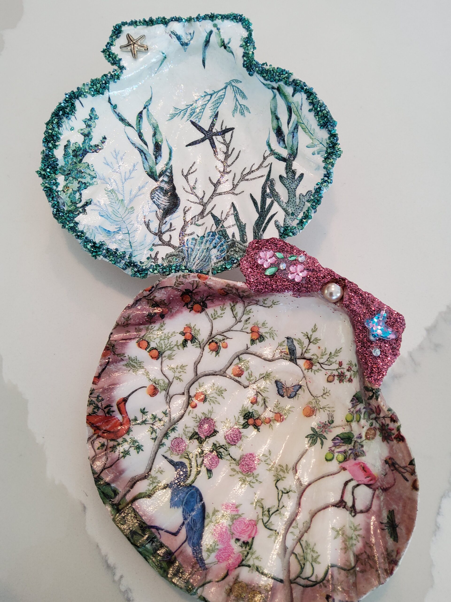 Treat yourself to a creative workshop where we'll breathe new life into lion's paw shells. Learn how to transform these natural treasures with napkin decoupage, paint, and embellishmentsr resulting in unique trinket or jewelry dishes.